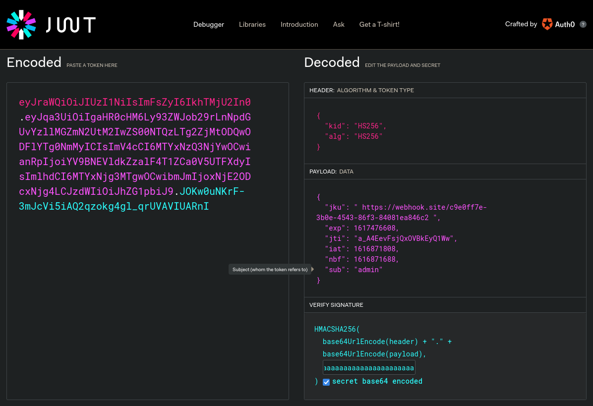With https://jwt.io you can decode/modify this to see the contents: Header: { “kid”: “HS256”, “alg”: “HS256” } Payload: { “jku”: “http://localhost:8080/secret”, “exp”: 1617476608, “jti”: “a_A4EevFsjQxOVBkEyQ1Ww”, “iat”: 1616871808, “nbf”: 1616871688, “sub”: “asdf_” }